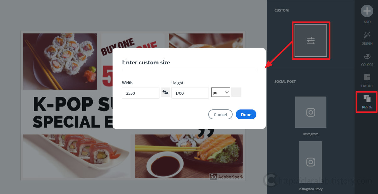 리사이즈는 원하는 형태 및 사이즈로 만들 수 있는 기능입니다. 커스텀을 눌러서 원하는 사이즈의 형태로 만들 수도 있습니다. 또한 Spark에서 제시하는 소셜 미디어 및 다양한 사이트를 위한 사전 설정도 다양하게 존재합니다.