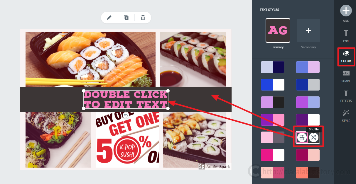 오른쪽 기본 인터페이스에서 COLORS(색상 팔레트)는 현재 보여주는 디자인 템플릿 전체의 색상을 세팅하는 기능입니다. 기본적으로 이 템플릿은 청색, 적색, 주황색, 오렌지색, 흰색의 5개의 색상을 활용하고 있습니다. 해당 색상톤을 커스텀할 수도 있고 DECORATIVE에서 아래로 보면 쭉 나열된 랜덤 색상 중에서 골라서 만들어 줄 수도 있습니다.