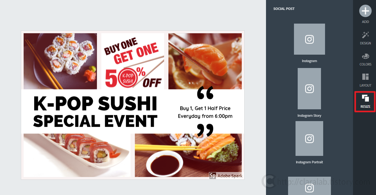 어도비 스파크(Adobe Spark)는 참 잘 만든 프로그램 중 하나입니다. 지금까지 작업한 것을 포토샵으로 하려면 어느 정도 시간이 필요한데 비해서 너무 간단하고 스피드 하게 그래픽 이미지를 만들 수 있습니다. 아직은 약간의 버그들이 존재하기 때문에 작업하다가 가끔씩 원치 않는 현상이 나타날 수도 있지만 작업하는데 큰 무리는 없다고 봅니다.
