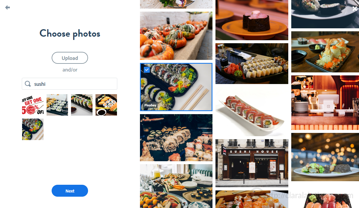 저는 먼저 Upload 버튼을 눌러서 내 컴퓨터에 있는(제가 만든 그래픽) 이미지를 업로드했습니다. 그리고 'sushi'라는 검색어를 통해서 원하는 이미지 몇 개를 선택했습니다.